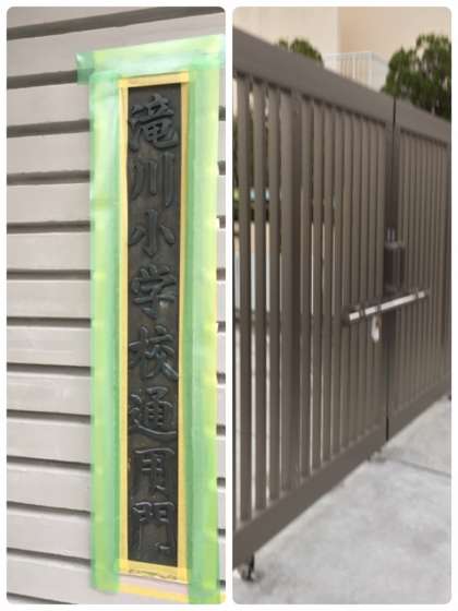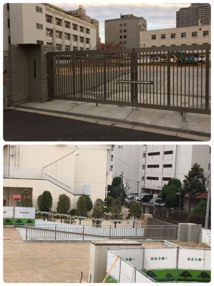 工事が進んでいます。南門が立てられ、プレハブを立てるための整地が行われています。