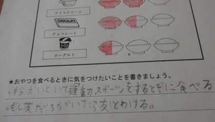 一人ひとり、おやつを食べるときに気をつけたいことを考えて、ワークシートに書きました。考えたことを参考にしながら、冬休みもおやつの食べ過ぎに気をつけて元気に過ごしてほしいと思います。