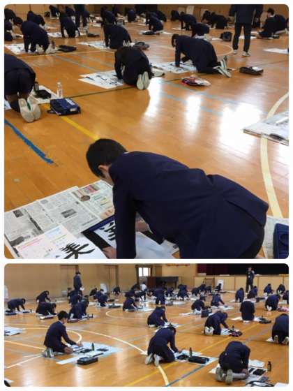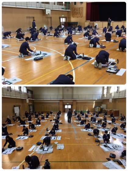 今日は、5,6年生が講堂で書初めをしました。6年生は、「希望の朝」5年生は「美しい空」でした。静かに集中して取り組んでいました。