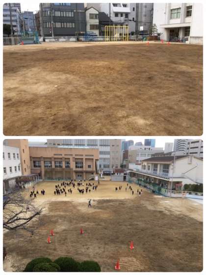 今日と明日フェンスが取れて久しぶりに運動場を見ることができました。プレハブ工事建設に向けて進んでいます。