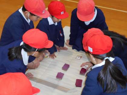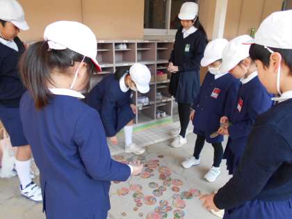 今日は新年を祝う会がありました。いいお天気でした。こま回し、羽根つき、けん玉、めんこ、おはじき、お手玉、すごろく、ぼうずめくり、かるたとりをしました。