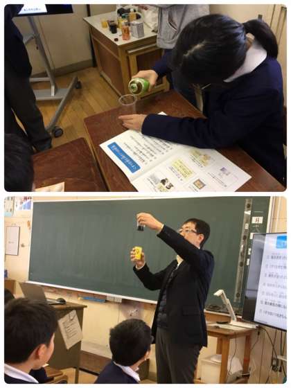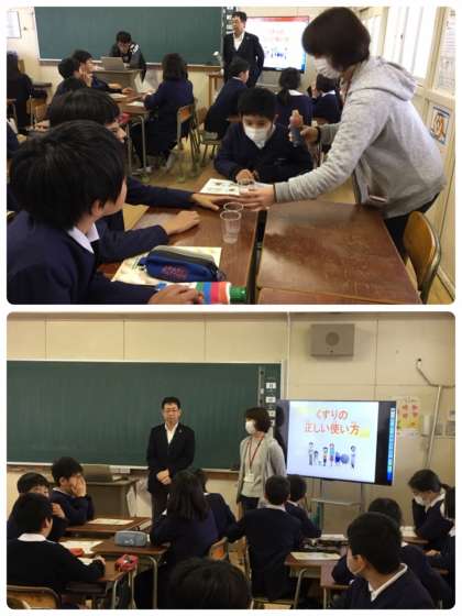 学校薬剤師の板東先生が来校され、お薬の使い方について話をしてくださいました。学校薬剤師さんはどんなお仕事をして薬の種類や飲むときの注意について分かりやすく教えてくださいました。ジュースやお茶でお薬を飲むとどうなるか実際に実験もしました。薬の効き目がなくなってしまう様子を実際に体験することができました。