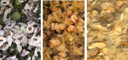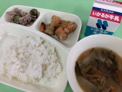 今日の給食は「ご飯、牛乳、さけのなんばんづけ、もずくのおみそ汁、れんこんの赤じそあえ」でした。