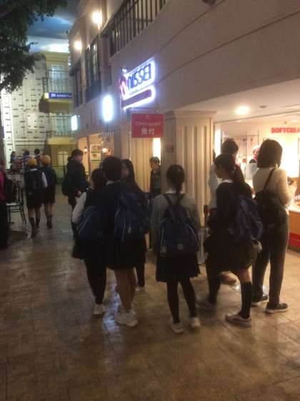 6年生は、卒業遠足でキッザニアに来ています。中学生、小学生、幼稚園児がたくさん来ています。今日は「英語の日」とのことで、外国人スタッフが英語で話しかけてきます。テレビ局も来ています。