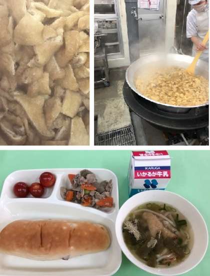 今日の給食に大阪名物のきつねうどんをイメージした「なにわうどん」が登場しました。三角に切ったうすあげが入り、小袋のとろろこんぶを添えていただきます。