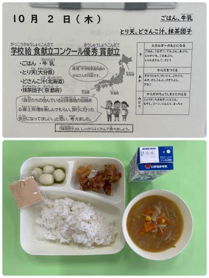 今日の献立は「ご飯、牛乳、とり天、どさんこ汁、抹茶団子」でした。