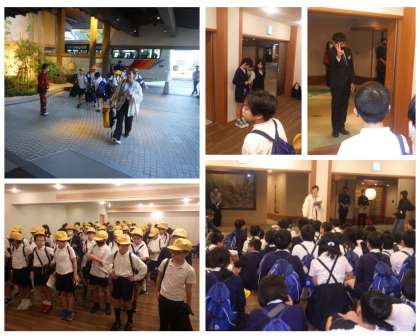 16:50 本日の宿舎である「むさし」に到着しました。開舎式では宿舎の方から、温泉を楽しみ、歴史を感じてくださいと話していただきました。いよいよ楽しみにしていた宿舎での生活が始まります。このあと避難訓練、入浴と続きます。