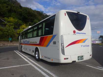 バスは順調に走り、紀の川SAに到着しました。2号車、1号車とも車内の半数は眠っています。15:30に出発します。この後1時間で学校に付く予定です。
