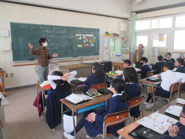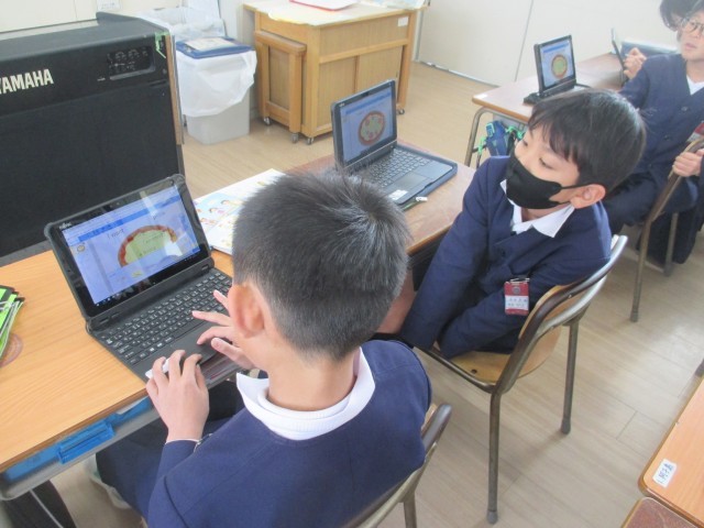 外国語活動では、栄養教諭の旭先生をゲストティーチャーに迎え、お気に入りのピザを作る活動をしました。ピザのトッピングとなる具材や三色栄養の言い方をおさらいし、注文の仕方を学びました。発表ノートを使って実際にピザを作り発表すると、それぞれが考えた個性あふれるピザをたくさん見ることができ、とても楽しい活動になりました。