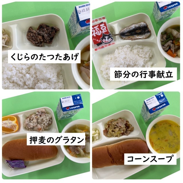 年に1回登場する「くじらのたつたあげ」、食物繊維たっぷりの押麦を使ったグラタン、コーンペーストの濃厚な甘みが大人気の「コーンスープ」など。