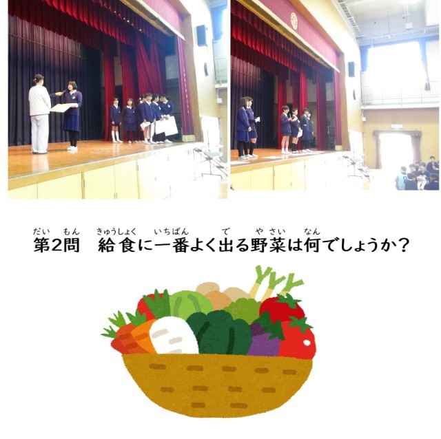 少し遅くなりましたが、1月の給食週間の取り組みとして給食委員会のクイズ集会がありました。最後に給食調理員さんに感謝のお手紙を渡しました。
