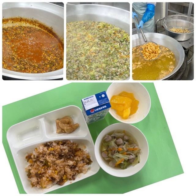 10日の献立は「ビーフケチャップライス、フライドポテト、キャベツのスープ、ダイスゼリー(みかん)、牛乳」でした。