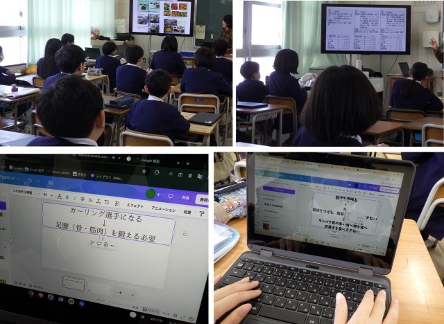 小学校6年間の食育の学習を振り返り、中学校で頑張りたいことや将来の夢をかなえるために食生活でどのようなことを心がければよいかを各自で考えてCanvaなどにまとめました。