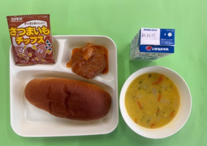 今日から給食が始まりました。黒糖パン、煮込みハンバーグ、コーンスープ、おさつチップス、牛乳。どれもおいしかったですね。