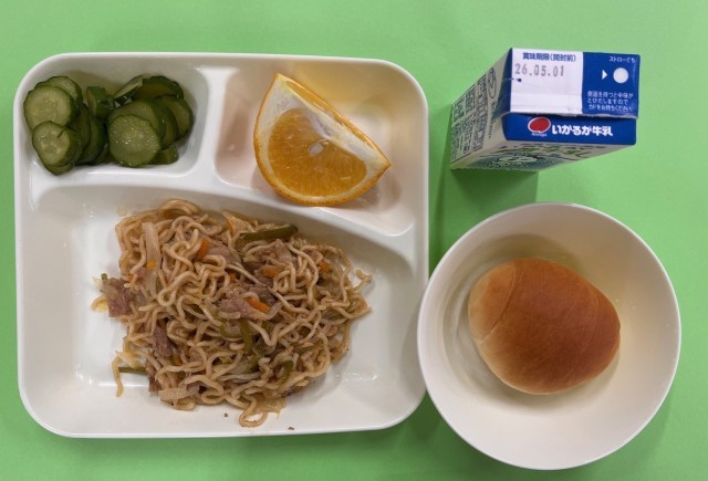 今日の献立は「ミニコッペパン、牛乳、焼きそば、きゅうりのしょうがづけ、あまなつかん」でした。