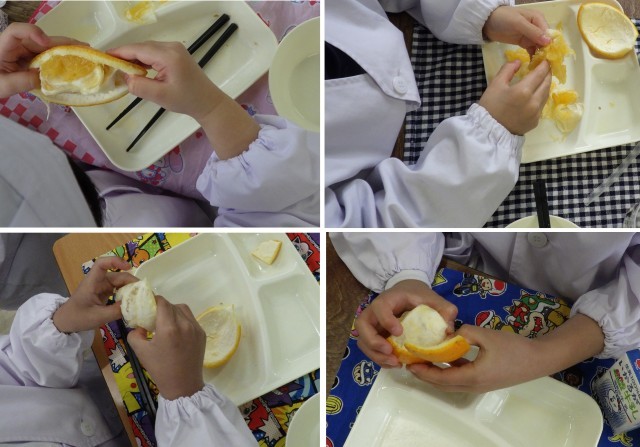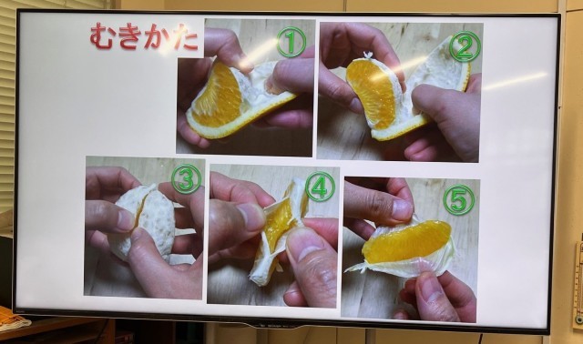 毎年、一口メモのスライドで皮のむき方を紹介しています。今年の1年生も頑張ってチャレンジしていましたね。
