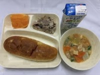 2月13日の給食は「なにわうどん、豚肉とごぼうの煮物、固形チーズ、おさつパン、牛...