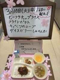 3月10日の給食は卒業祝い献立「ビーフケチャップライス、フライドポテト、キャベツ...
