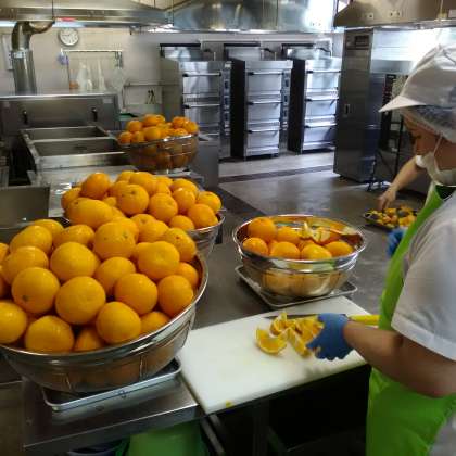 今日はデザートに甘夏柑がつきます。食べやすい大きさに調理員さんがカットしてくれます。上手に食べることができたかな。