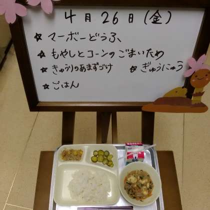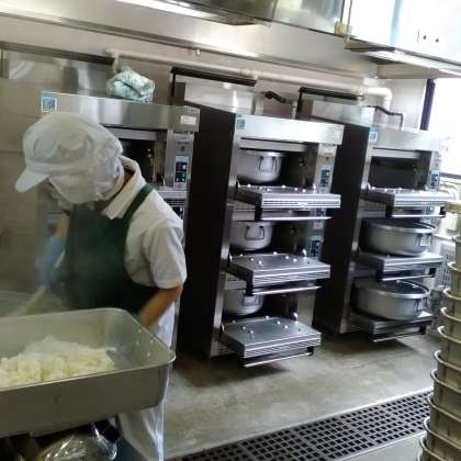 今日のメニューはピリ辛の「マーボーどうふ」でした。味付けにもいろいろバリエーションがあります。調理室の奥には沢山のご飯を炊く大きな炊飯器があります。