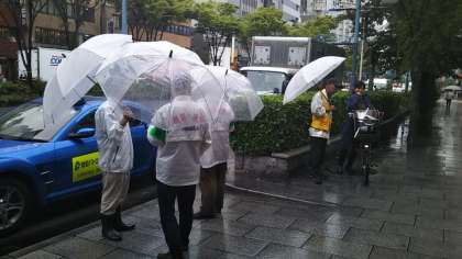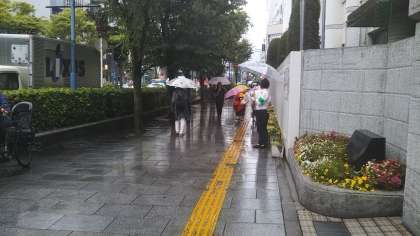 雨の中、堀川地域と天満警察署が連携して登下校時間帯に合わせた見守り活動が行われました。