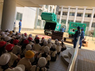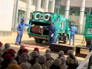 「2トン=2000キロのごみを積みます」「「1日6回、収集します」などのお話の後、パッカー車を開けてごみをおろす方法や、粗大ごみがバリバリと砕かれる様子も見ました。みんな、びっくりです。
