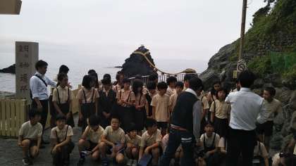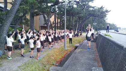 海沿いを散歩しました。雨が降ってきそうな空模様ですが、この後朝食・閉舎式をして鳥羽水族館へ出発します。