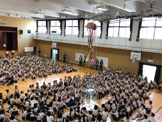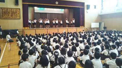 運動委員の人たちが音楽に合わせて準備の体操、おわりの体操を舞台で紹介。また、プールカードを忘れない、プール内は走らない、飛び込まない等、ルールを確認しました。恒例のくすだま割りもあり、とても集会が盛り上がりました。
