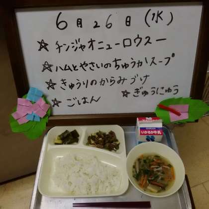 今日の給食は、「チンジャオニューロウスー(青椒牛肉絲)」。