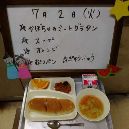 今日の給食は、おさつぱん、かぼちゃのミートグラタン、スープ、オレンジ、牛乳でした。