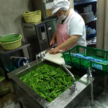 写真は、調理員さんが、オクラを水槽であらってくれています。