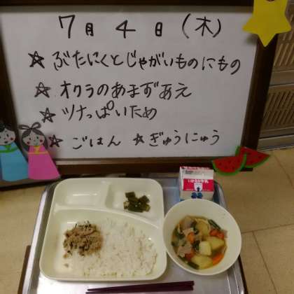 今日の給食は、ごはん、豚肉とじゃがいもの煮物、オクラの甘酢あえ、ツナっ葉いためでした。