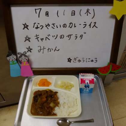 今日の給食は、夏野菜のカレーライス、キャベツのサラダ、みかん(かんづめ)、牛乳でした。