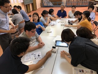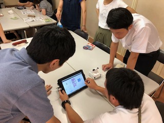 この日は、2社の教材を実際に動かしながらの研修です。先生たちも、とても楽しそう。