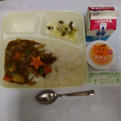 今日の給食は、ビーフカレーライス、野菜のピクルス、みかんゼリーでした。