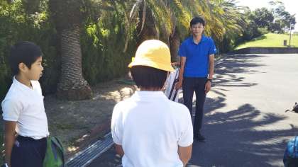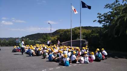 淡路青少年交流の家に到着しました。みんな元気です。入所式ではお世話になる職員の方にご挨拶しました。これから食べるお弁当が楽しみです。心地よく風が吹き、海も美しくかがやいています。