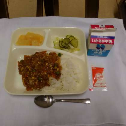 今日の給食は、大豆入りキーマカレーライス、グリーンサラダ、白桃でした。
