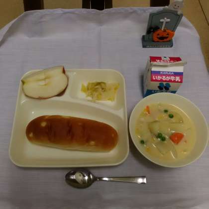 今日の給食は、コーンクリームシチュー(米粉)、はくさいのピクルス、りんご、おさつパン、牛乳でした。