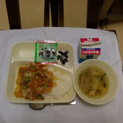今日の給食は、ピリ辛丼、ソフト黒豆、中華スープ、牛乳でした。