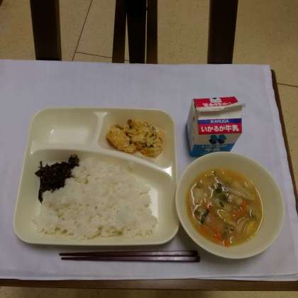 今日の給食は、千草焼き、ごまひじき、みそ汁、ごはん、牛乳でした。
