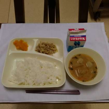 今日の給食は、豚肉とまいたけのいためもの、つみれ汁、かぼちゃういろう、ごはん、牛乳でした。
