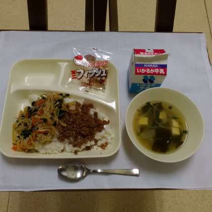 今日の給食は、ビビンバ、わかめスープ、アーモンドフィッシュ、牛乳でした。