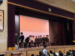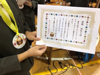 今日の児童朝会は8日に実施された全校オリエンテーリングの表彰式がありました。縦割り班で協力し合い、高得点をマークした1〜3位の班が表彰されましたが、どの班も成績がよかったとのことです。