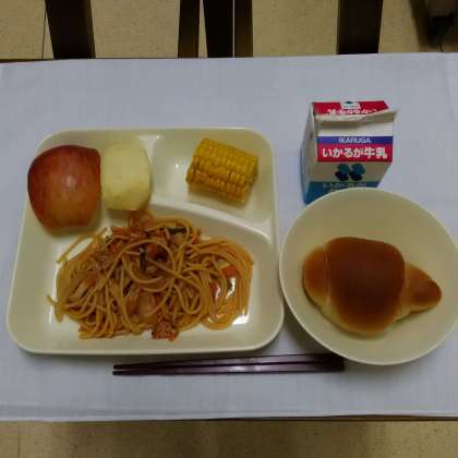 焼きトウモロコシ、りんご、黒糖パン、牛乳でした。