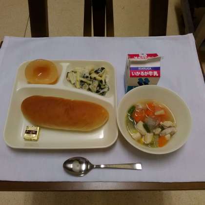今日の給食は、ほうれん草のグラタン、スープ煮、白桃(かんづめ)、コッペパン、バター、牛乳でした。