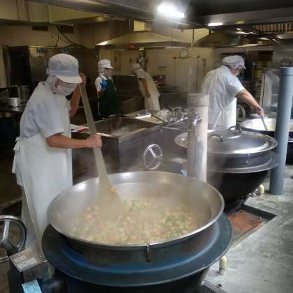 おいしいだしと、大きなカマで、調理員さんの愛情たっぷりの給食です。