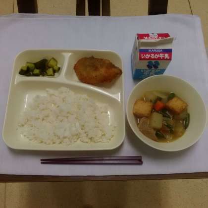 今日の給食は、たらのフライ、豚肉とあつあげの煮物、あっさりきゅうり、ごはん、牛乳でした。
