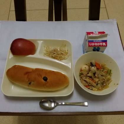 八宝菜、もやしのごま酢あえ、りんご、レーズンパン、牛乳でした。