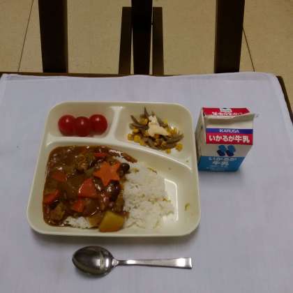 今日の給食は、豚肉と金時豆のカレーライス、ごぼうサラダ、プチトマト、牛乳でした。