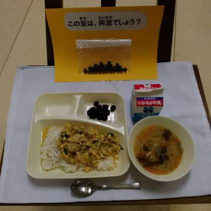 今日の給食は、親子丼、黒豆の煮物、みそ汁、牛乳でした。